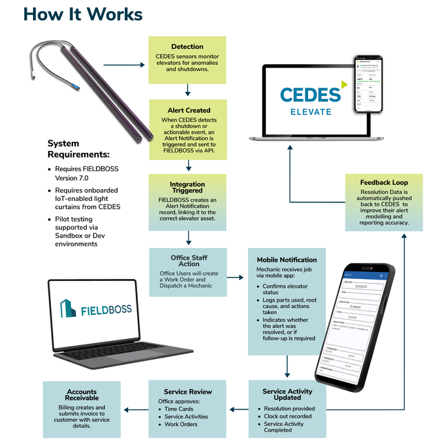 The integration between CEDES’s smart sensors and FIELDBOSS’s field service platform ensures elevator issues are detected and resolved faster than ever - often before passengers even notice a problem.